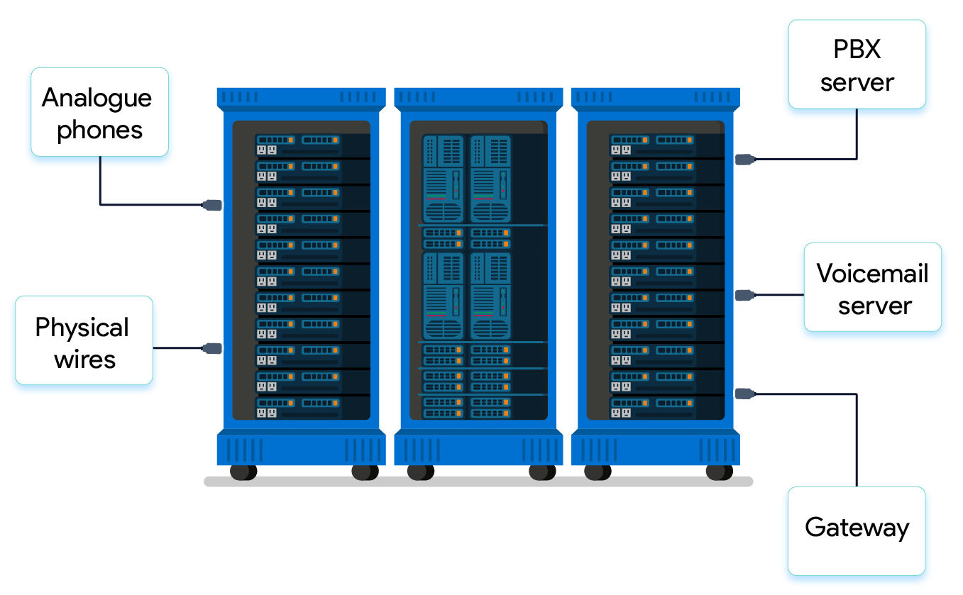 PBX phone systems are infrastructure-heavy. They require components like PBX server, physical wires, voicemail server, etc to be bought and stored on-premises